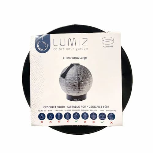 Met de LUMIZ Metal Ring Large kun je jouw LUMIZ lampion ook als staande lamp gebruiken. Heb jij in de tuin mooie LUMIZ lampionnen hangen maar mis je nog een mooie sfeervolle lamp op tafel? Met de LUMIZ Metal Ring Large kun je van jouw LUMIZ lampion een mooie tafellamp maken. Ook als staande lamp komt het schaduwpatroon van mooi tot zijn recht op het tafelblad.