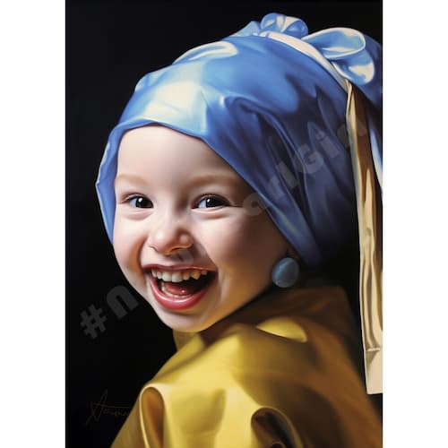 Deze leuke postkaart is geïnspireerd op het Meisje met de Parel van de wereldberoemde schilder Johannes Vermeer uit Delft. Ontworpen en gemaakt door de eigenzinnige fotograaf Gustav, ook uit Delft. Bella is een vrolijke peuter van pas 2 jaar oud. Ze straalt als een ster!
