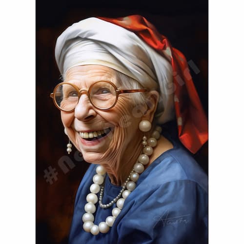 Deze leuke postkaart is geïnspireerd op het Meisje met de Parel van de wereldberoemde schilder Johannes Vermeer uit Delft. Ontworpen en gemaakt door de eigenzinnige fotograaf Gustav, ook uit Delft. Als je bij oma Fran op bezoek gaat, ga je nooit weg zonder haar beroemde appeltaart te hebben geproefd!
