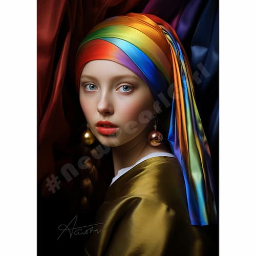 Deze leuke postkaart is geïnspireerd op het Meisje met de Parel van de wereldberoemde schilder Johannes Vermeer uit Delft. Ontworpen en gemaakt door de eigenzinnige fotograaf Gustav, ook uit Delft. Kelly draagt alle kleuren van de regenboog. Een geweldige combinatie. Je ziet er fantastisch uit, Kelly!