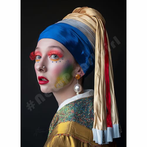 Deze leuke postkaart is geïnspireerd op het Meisje met de Parel van de wereldberoemde schilder Johannes Vermeer uit Delft. Ontworpen en gemaakt door de eigenzinnige fotograaf Gustav, ook uit Delft. Rita houdt er echt van om zich mooi aan te kleden, en waarom ook niet? Mensen zijn altijd blij om haar te zien!