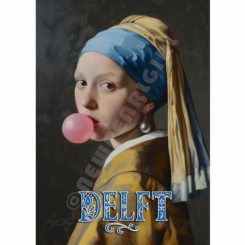 Deze leuke postkaart is geïnspireerd op het Meisje met de Parel van de wereldberoemde schilder Johannes Vermeer uit Delft. Ontworpen en gemaakt door de eigenzinnige fotograaf Gustav, ook uit Delft. Een ode aan de mooiste stad van de wereld.