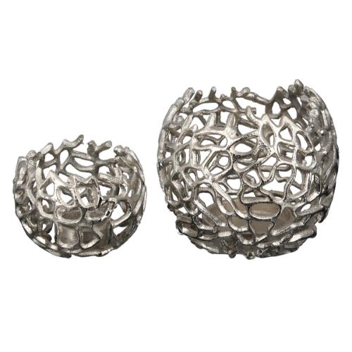 Gemaakt van licht maar stevig aluminium hebben deze houders een robuuste uitstraling met een verfijnde afwerking. Dankzij het open patroon verspreidt het kaarslicht zich op een warme en sfeervolle manier door de ruimte.
